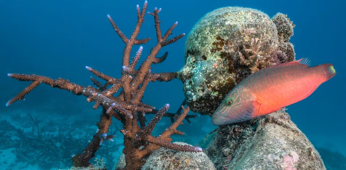 In March 2020, 131 corals were transplanted onto Taylor’s sculptures. After one year, 91.6% of the coral survived.