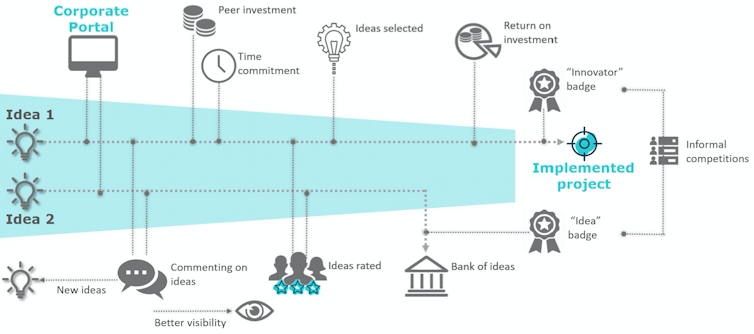A typical way this would work would be for an organisation to set up a platform such as a website on which to post and share ideas. Employees receive points every week or month to “invest” in proposed ideas they like. After the best ideas are selected, the successful “investors” receive dividends in points, which can then be reinvested. The points don’t have a monetary value, but people assign status value to them. Playing investor is both fun and serves a serious purpose.