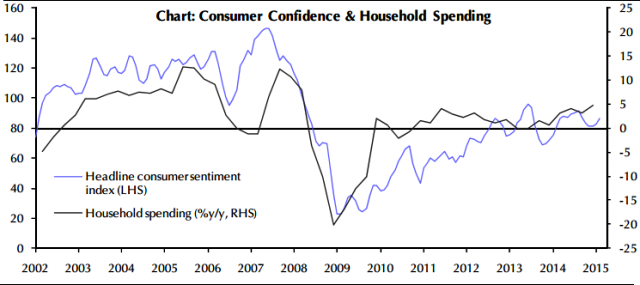 The breakdown was reasonably encouraging. Household spending growth was particularly strong in Q4, rising by 1.6% on the quarter. Over 2014 as a whole, household spending rose by 3.7%.