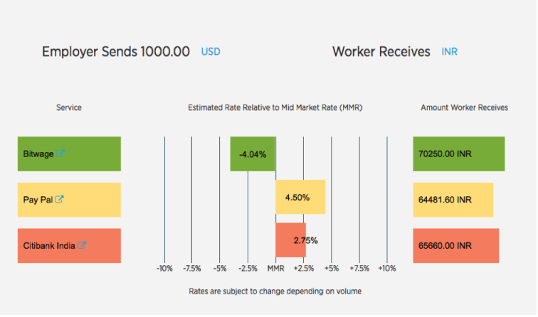 As Bitwage uses bitcoin as a transfer mechanism, Indians can now receive payments from the United States, Europe and the UK at better rates than ever, the release said. For instance, an employee receiving $1,000 USD sent to India could receive 70250.00 INR with Bitwage, far more than an estimated 64481.60 INR through Paypal or approximately 65660.00 INR via Citibank India.