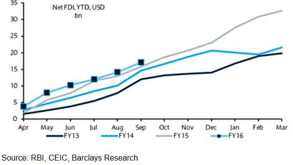Government has been easing FDI regime since it took powers, USD17.1bn of net inflows are seen in first half of 2015, last year net FDI was USD 32 bn, following a series of liberalisation steps since September 2015, when Government in conjuction with Reserve Bank, announced opening of bond market to greater foreign paarticipation.