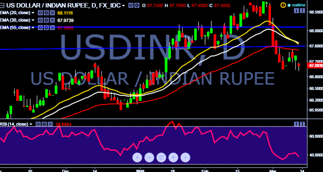 We prefer to take short position in USD/INR around 67.15, stop loss 67.55 and target 66.55 levels.