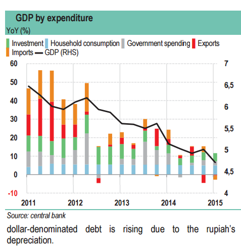 The slowdown was particularly sharp in the mining industry, reflecting the decline in commodity prices, but also the contraction in production volumes following the export ban on certain unprocessed mining products since 1 January is also hurting from the economic slowdown in China, its second largest trading partner since 2009. China's share of Indonesian exports dropped from 12.4% in 2013 to 10% in 2014.