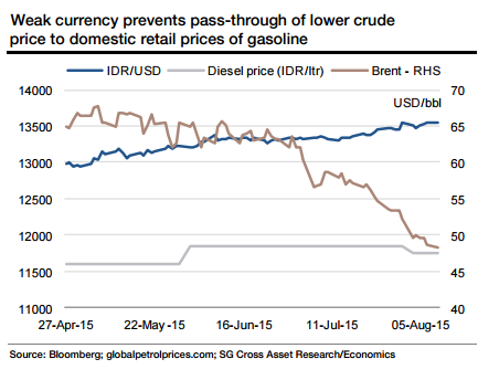 The IDR crossed the 13,500 mark vs the USD in August 2015, flirting with its 17-year low when the Asian crisis was upon us. While oil prices remaining weak implies lower revenue from the oil and gas sector, domestic retail prices of motor fuel have actually gone up, despite falling crude prices, as the currency continued to weaken and revenue concerns came to the fore. It is only recently, in early August 2015, that retail prices have fallen a tad after crude prices declined by a quarter from their June 2015 peak.