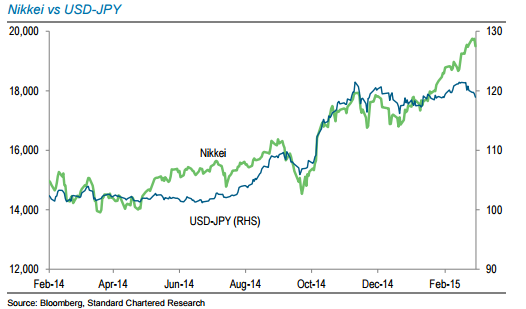 - Eric Robertsen of Standard Chartered comments, "A big focus of domestic investors was the change in correlation between USD-JPY and the Nikkei as the Nikkei has made new highs while USD-JPY has weakened. As recently as February, the 30-day rolling correlation between the two markets was as high as +0.60, but it has fallen recently to marginally negative levels."