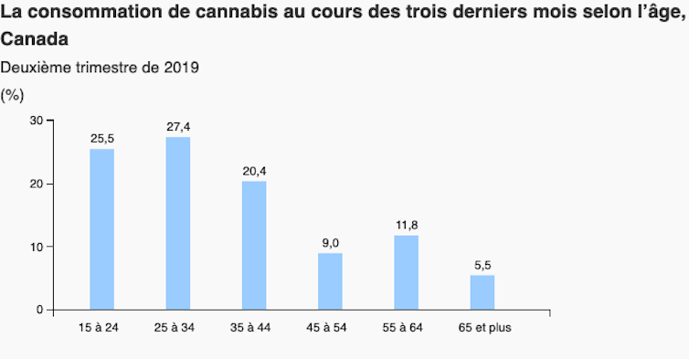 Consumption of cannabis in the last three months in Canada according to age. Centre for Cannabis Statistics, Statistics Canada, 2019