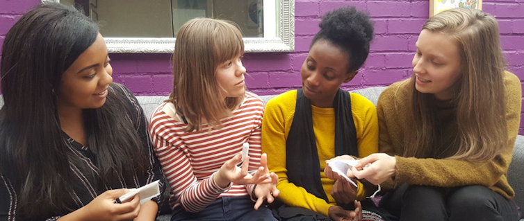 Ugandan school girls complete a feedback questionnaire. © Irise International, Author provided