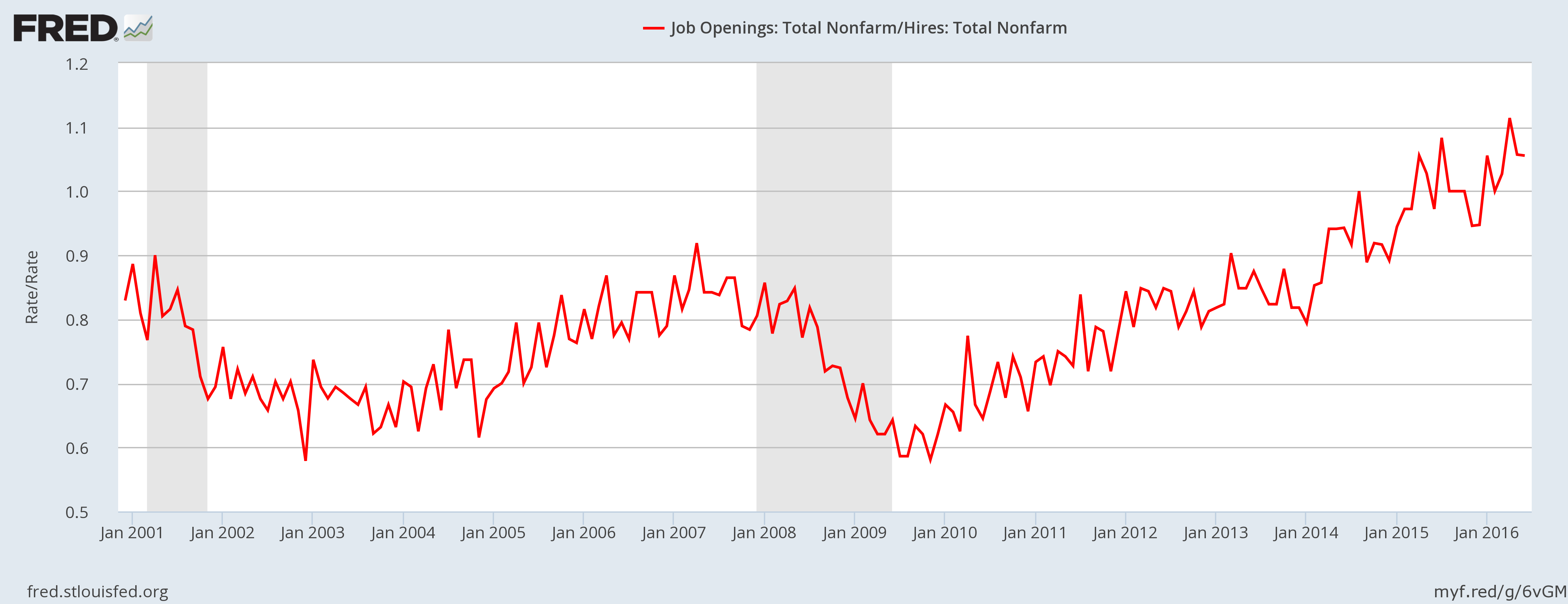 Latest data from JOLTS points at a deterioration in employment suitability ratio. This is a simple ratio calculated from the data of total job openings to total hires. Whenever the number reaches above 1, it means the economy is close towards maximum employability. It means that there are more job openings than hires, which basically means due to lack of suitable candidates, positions are not being filled. In the past 15 years of history (records go till 2001) this number has never gone above 1. This year, it has remained above 1.