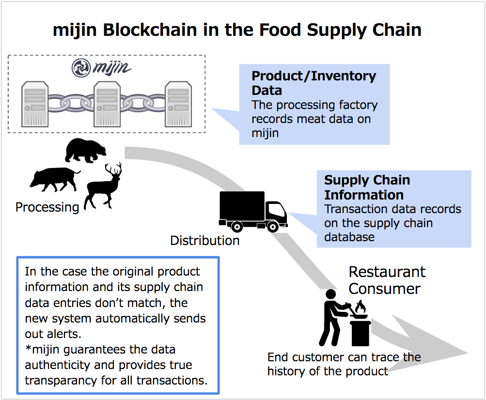 Japan Gibier Promotion Association needs to record the meat supply chain data, from the hunting ground to the restaurant. By using the mijin blockchain, it will determine whether data (date, transit point, manager, item name, amount, price, etc) from the game meat processing factory is properly recorded on the blockchain in a visible and verifiable way, and whether the alert system designed for automatic detection of falsified data is complete.