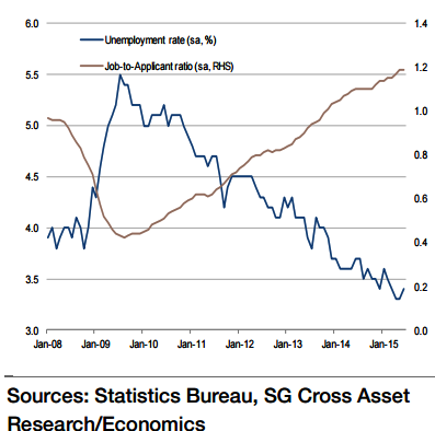 "The job-to-applicant ratio is likely to rise further to 1.20 in June from 1.19 in June. This is the highest level since 1992 and indicates that companies remain willing to increase their hiring", added Societe Generale.