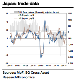 Japan's trade balance is expected to have reached a balance level in yen terms in October. This will be a significant improvement in the trade as it recorded deficit of JPY742bn in October 2014. On a seasonally adjusted basis, the trade deficit might have reduced to JPY90bn in October, against September's JPY356bn deficit, says Societe Generale in a research note.
