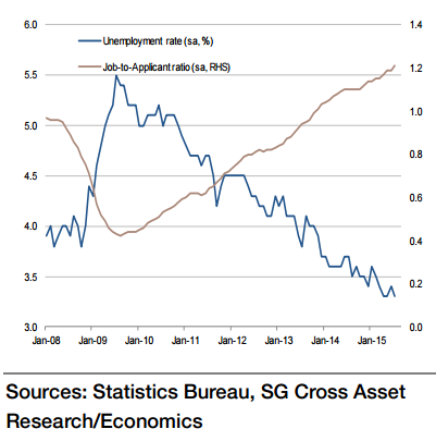 "The job-to-applicant ratio is likely to remain unchanged at 1.21 in August, which is the highest level since 1992, indicating that companies remain willing to increase their hiring", added Societe Generale.