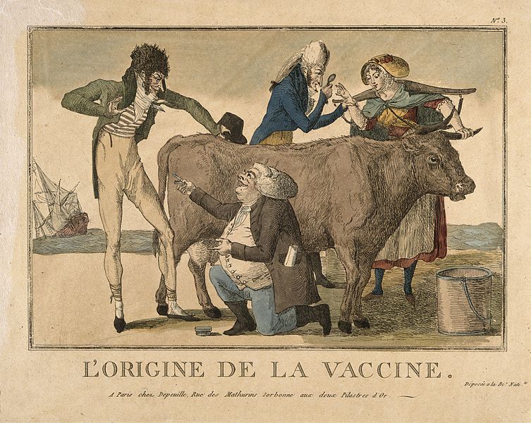 There was a belief in the countryside that people who looked after cows and had been infected with cowpox could not catch smallpox (milkmaids were said to have attractive non-pockmarked skin). In 1774, Benjamin Jesty deliberately infected his wife and sons with cowpox in an attempt to protect them from smallpox. What Jenner did was to take this a stage further, to vaccinate his patient with cowpox (the Latin word “vaccinus” means “from cows”), and then see if that stopped the symptoms that occurred after a person was variolated with smallpox.