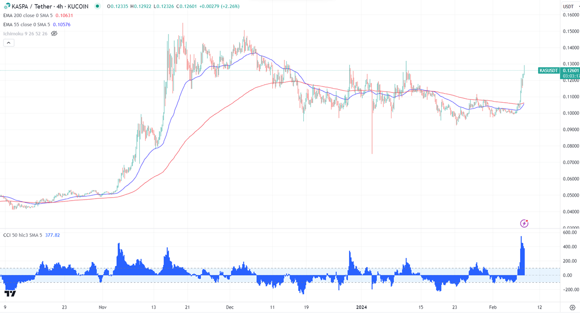 KASUSD surged more than 30% in the past three days after a long consolidation. It hit a high of $0.1299 and is currently trading around $0.1260.