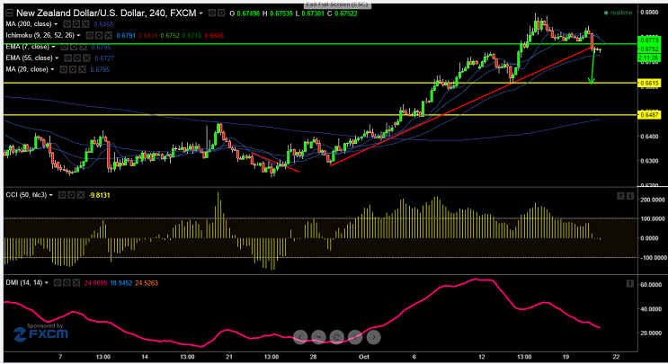 NZD/USD has broken major trend line support around 0.6760 (trend line joining 0.6299 and 0.6380) and break below confirms minor weakness , a decline till 0.6650/0.6620 is possible.