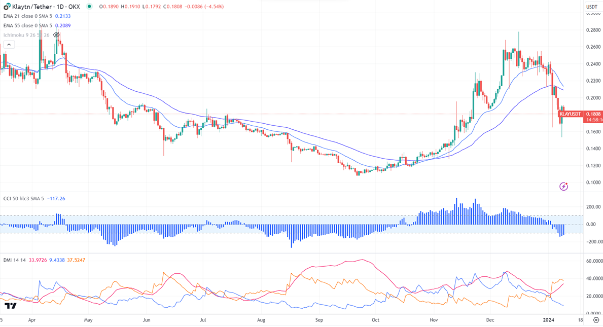 KLAYUSD prices pared more than 40% after jumping more than 150%. It hit a high of $0.277 and is currently trading around $0.1825. The pair is holding above the short-term (21 and 55-day EMA) and above the long-term moving average (200-day EMA).