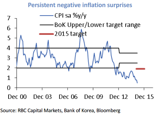 Activity indicators are also lacklustre. BoK lowered this year's growth forecast to 3.4% from 3.9%. But the weak hand off from 2014 of 2.7% suggests downside risk to this forecast.