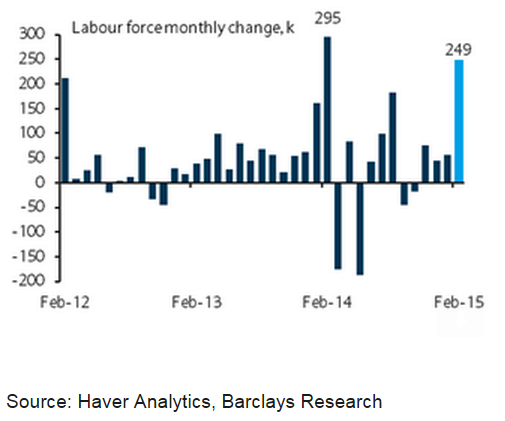 On a seasonally adjusted basis, the rise in unemployment rate was caused by an unusually large 249k (2014 monthly average: 46k) increase in the labour force.