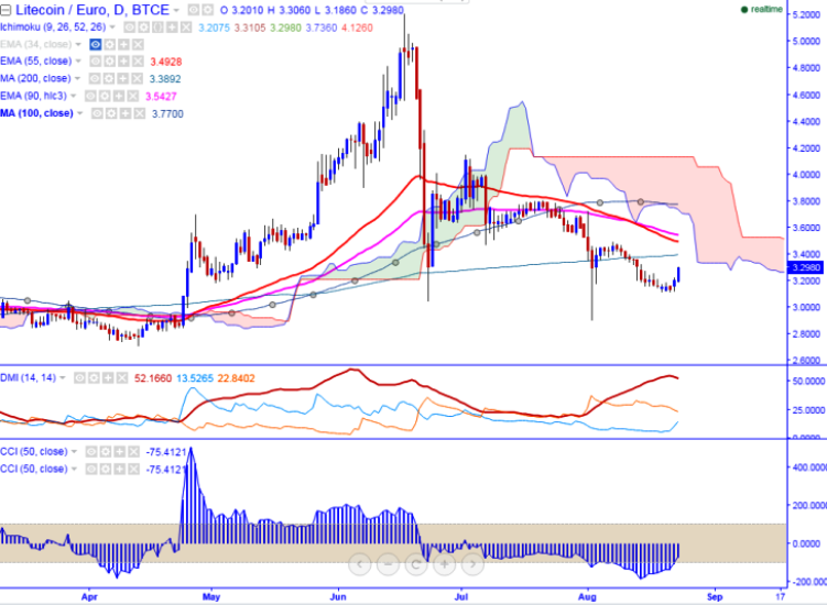 LTC/EUR is seen trading above on Tuesday. The pair has slightly recovered from the 3.1190 yesterday (BTCE). It is currently trading around 3.369 at the time of writing.