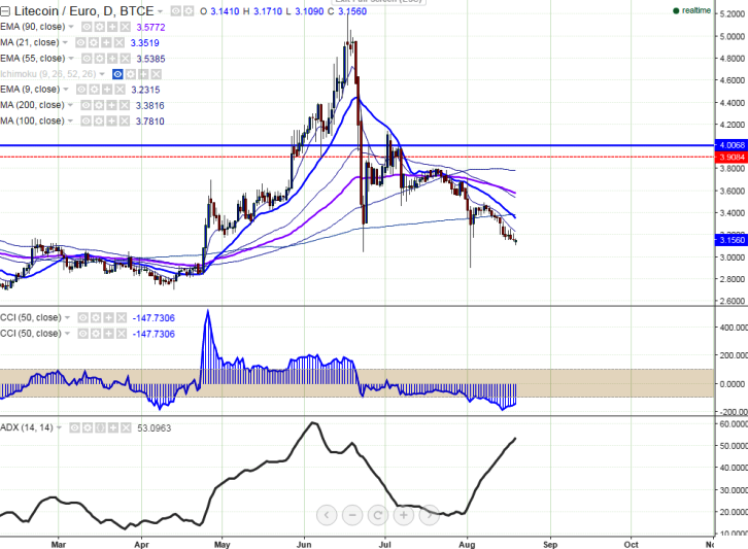 LTC/EUR is slightly recovering on Friday after the plunge. The pair has broken minor support at 3.1570 and slightly declined till 3.1090 levels (BTCE). It is currently trading around 3.1540 at the time of writing.