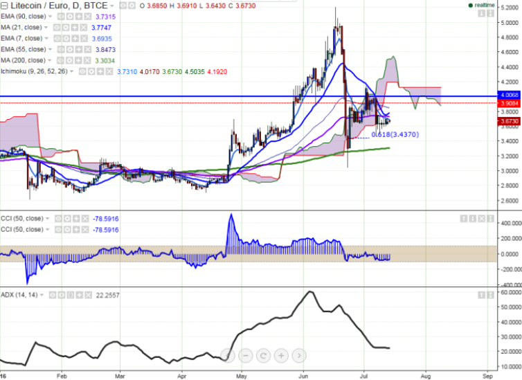 Long-term trend remains to be bullish. The short- term trend seems bearish. LTC/EUR is struggling to close above 4 level. So a decline till 3.46 can be seen.