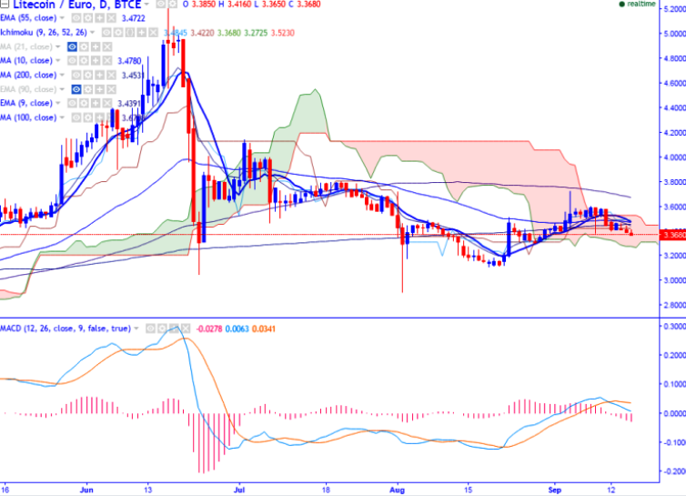 LTC/EUR is seen trading well below in red on Friday. The pair is has broken major support 3.378 and declined slightly below that level (BTCE). It is currently trading around 3.3680 at the time of writing.