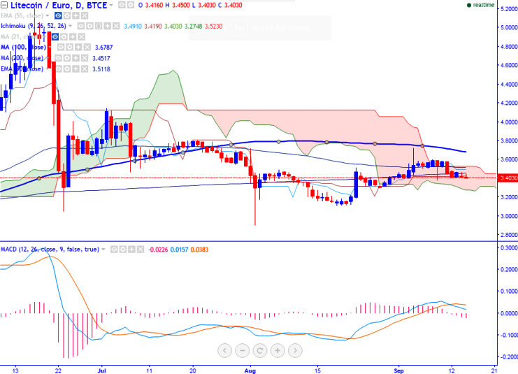 LTC/EUR is seen trading below in red on Thursday. The pair is has broken 200 –day MA and trading slightly below that level (BTCE). It is currently trading around 3.4030 at the time of writing.
