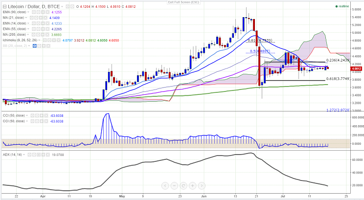 LTC/USD traded in the red on Monday, falling to 4.06 levels so far in the day. It is currently trading at 4.07 levels at the time of writing (BTC-e).