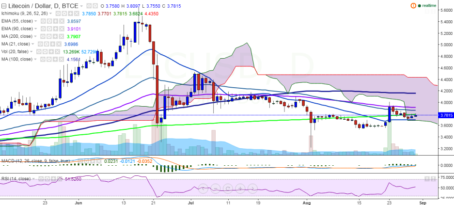 LTC/USD further moved upwards on Tuesday, continuing its rebound from 3.71 levels hit on August 28. It is currently trading at 3.78 levels at the time of writing (BTC-e).