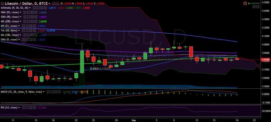 LTC/USD is continuing to trade flat below 200-DMA. It has hit 3.84 levels so far in the day and continues to hover around this level (BTC-e).