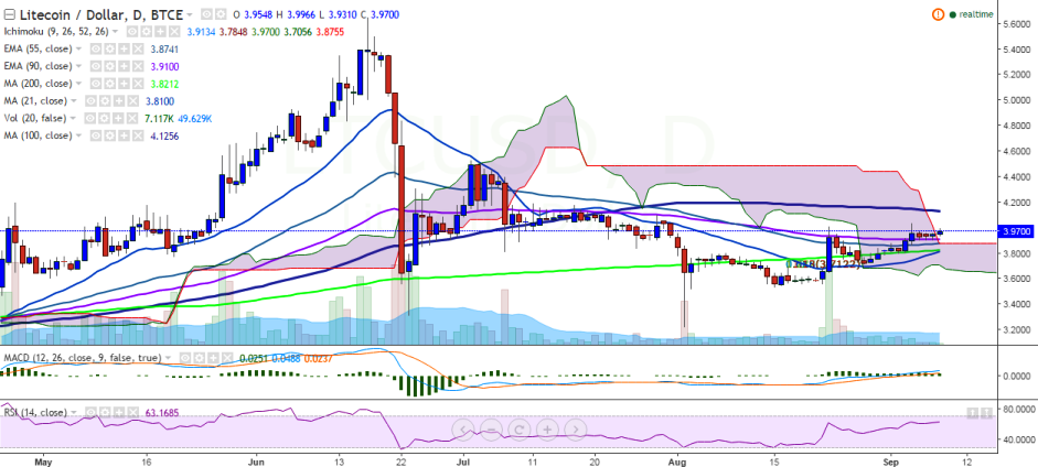 LTC/USD is looking to hit the previous high of 4.03 levels (September 04) and is currently trading at 3.99 levels at press time (BTC-e).