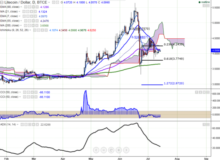 LTC/USD continues to trade in a narrow range, holding its strength above the 4.00 mark. It currently trades at 4.09 levels at the time of writing (BTC-e).