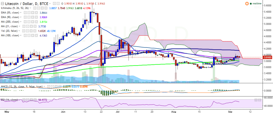 LTC/USD is trying to hold its strength above 90 EMA and is hovering around that level. It is currently trading at 3.91 levels at press time (BTC-e).