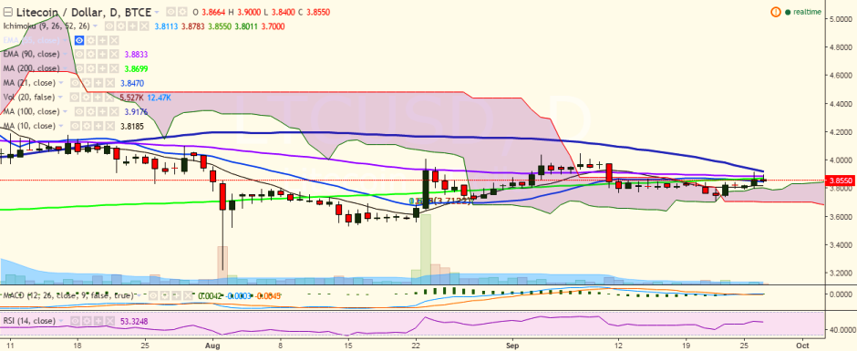 LTC/USD broke above 200-DMA and hit 3.91 levels on Monday. It is currently hovering around 200-DMA and trading at 3.86 levels (BTC-e).