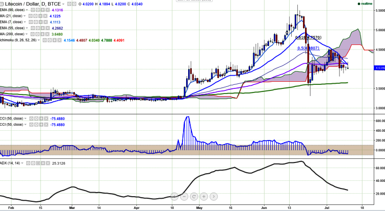 LTC/USD briefly broke above 90 EMA and hit a high of 4.18 levels so far in the day. However, it could not hold its strength and retreated. It currently trades at 4.02 levels at the time of writing (BTC-e).