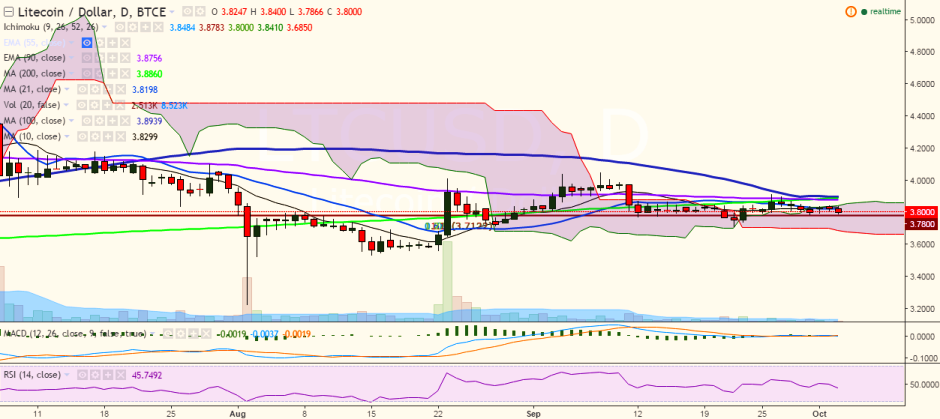 LTC/USD has hit a fresh low of 3.79 levels so far in the day, after it touched 3.843 levels on October 02. It is currently trading at 3.80 levels (BTC-e).
