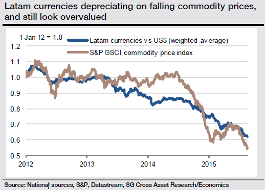 "It seems that the currency depreciation alone would be able to lift exports meaningfully given depressed growth in China and the low price elasticity of Latam exports (commodities). As a result, for most Latam economies export gains could be limited and may not be strong enough to stimulate a strong investment cycle in the medium term", says Societe Generale in a research note to its client.