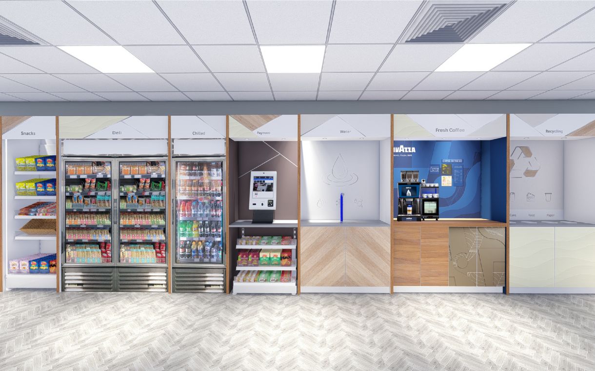 The micro-café includes standard vending snacks and cold drinks together with bean-to-cup coffee machines that make espresso-based drinks like lattes and cappuccinos as well as smart fridges with built-in payments.