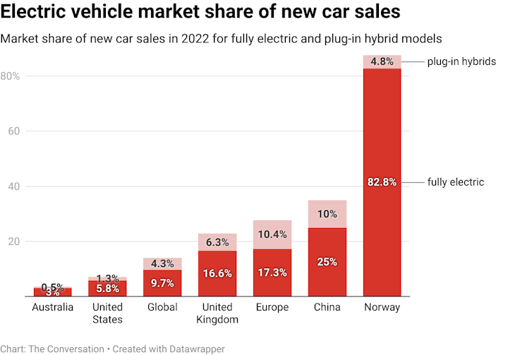 The world leader is Norway, where 87.6% of new cars (including 4.8% plug-in hybrids) are electric. Australia’s figure is also far lower than in Europe (27.7%, including 10.4% plug-in hybrids), China (35%, 25% fully electric) or even the United States (7.1%, 5.8% fully electric).