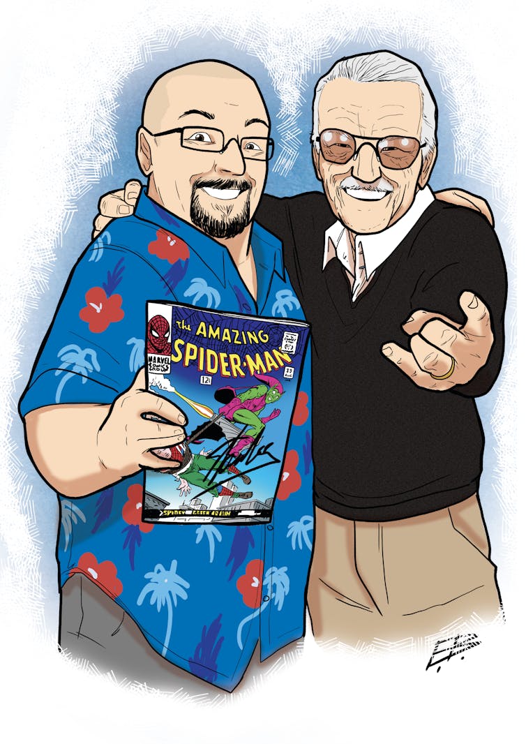 So I decided not to get my photo with him. I don’t know if I made the right decision, but on hearing of Lee’s death I asked an artist friend, Elliot Balson, to draw a picture of me meeting him (below). I know it’s self-indulgent, but I’m finally meeting this man who gave me so much, where I’ve always met him – in the comics.