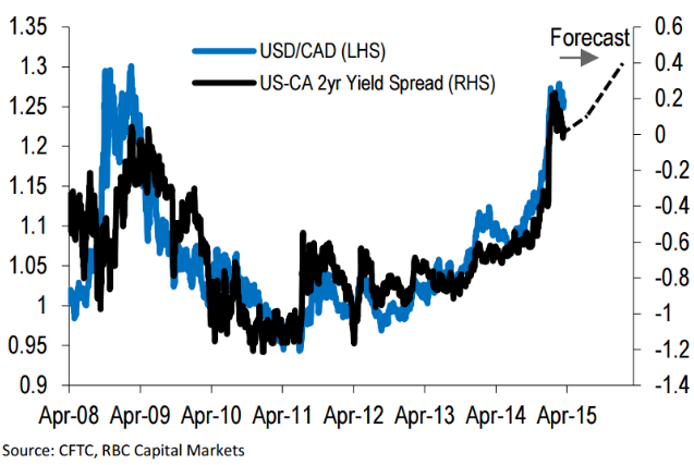 "We believe the key drivers of USD/CAD strength should come to a head in the second half of 2015 and we continue to call for a Q3 peak of 1.31. The BoC has taken on a firmly neutral message, and our economists expect the BoC to keep rates at 0.75% until Q2 2016. Regardless of the exact timing of an eventual rate increase though, the issue is that the BoC hiking cycle will considerably lag that of the Fed, which is likely to begin in the second half of this year." says RBC Capital Markets