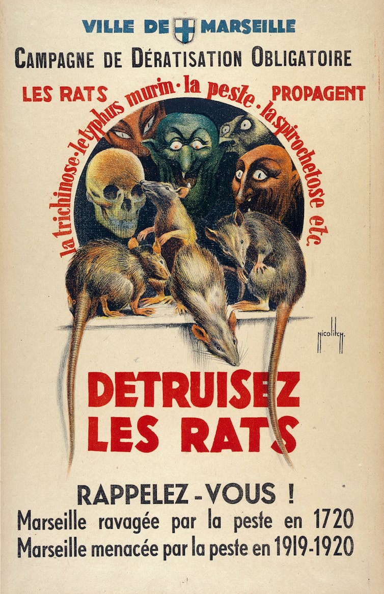 A 1920 French poster showing rats as monsters causing death and diseases. Colour lithograph by O. Nicolitch. Wellcome Collection, CC BY