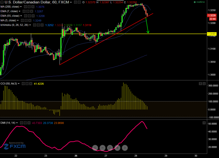 - The pair is facing minor trend line support around 1.3225 (trend line joining 1.30396 and 1.31685) and break below targets 1.3150/1.3120 level in short term.