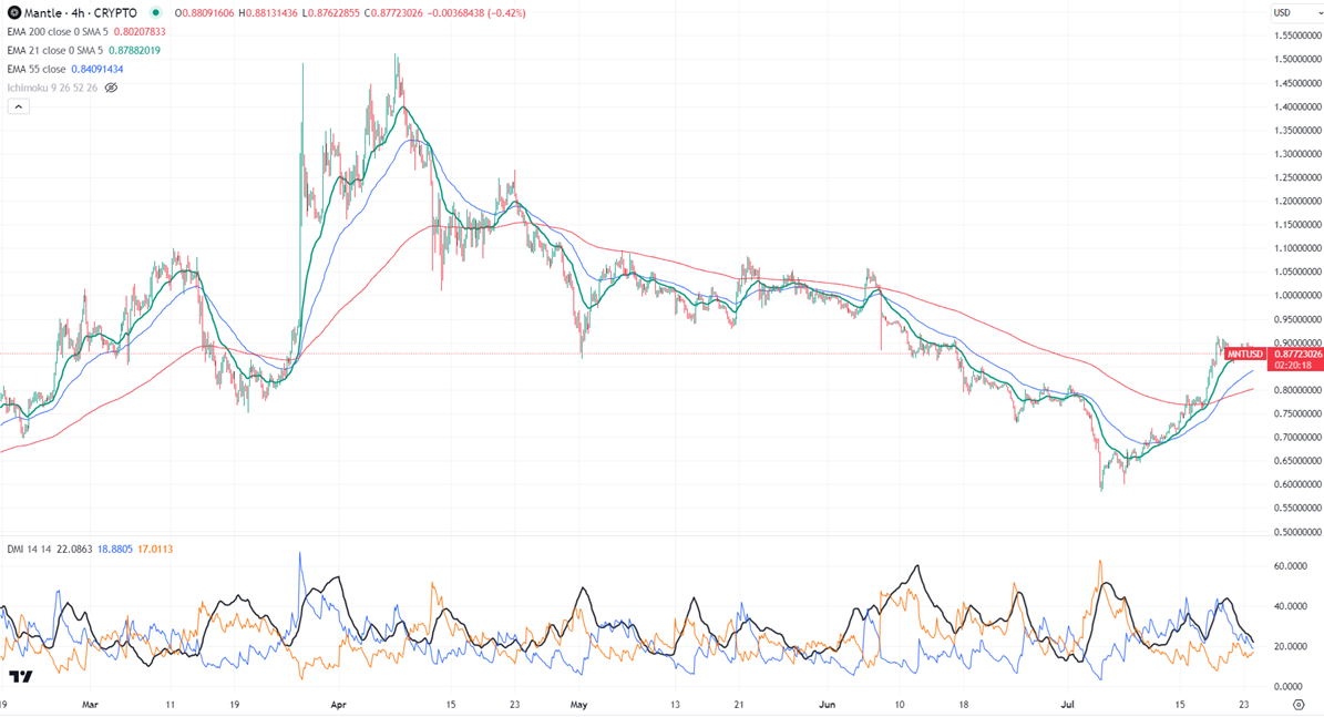 MNTUSD prices are consolidating after a minor pullback. It hit a high of $0.913 and is currently trading around $0.877. The pair is holding above the short-term (21 and 55-day EMA) and above the long-term moving average (200-day EMA).
