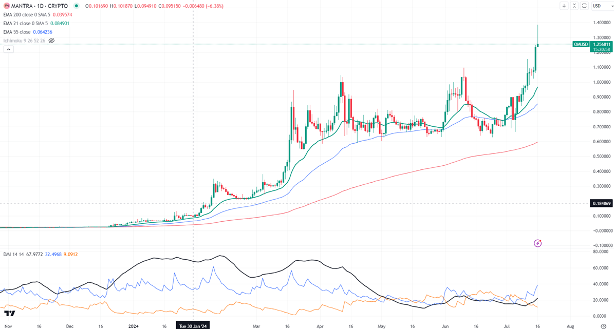 OMUSD surged more than 100% in the past three weeks. It hit a high of $1.3849 and is currently trading around $1.2543.