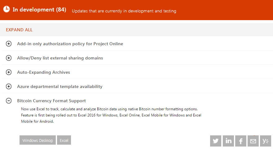 According to the roadmap, ‘Bitcoin Currency Format Support’ will be rolled out to Excel 2016. Needless to say, this announcement signifies the growing popularity of Bitcoin.