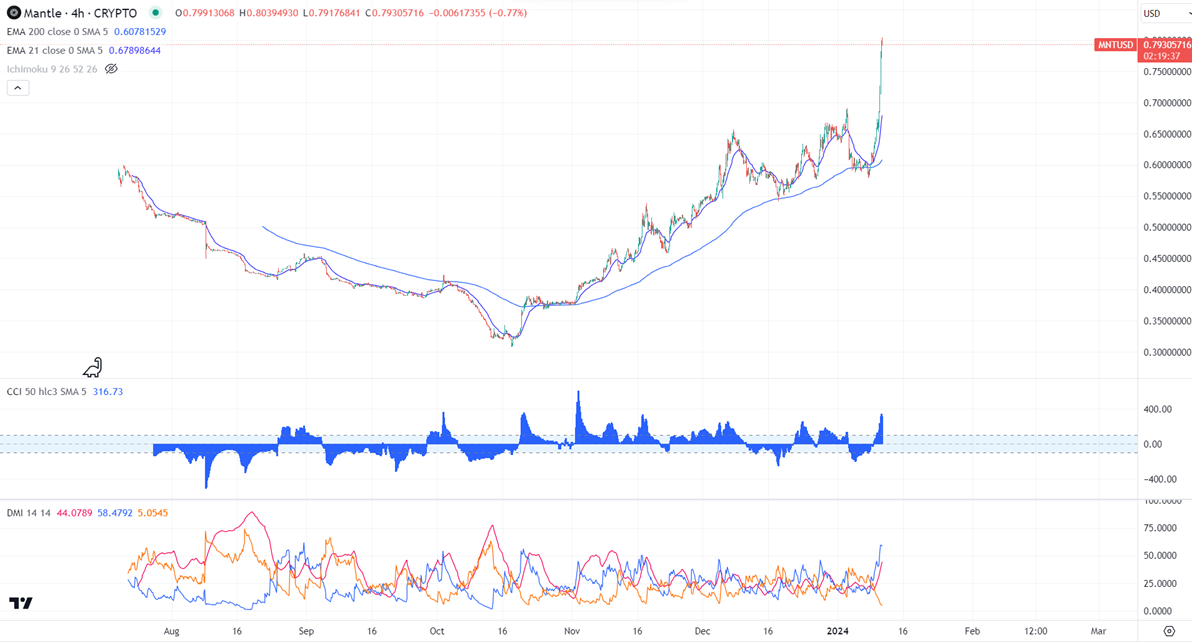 MNTUSD prices surged more than 35% in the past three days. It hit a high of $0.839 and is currently trading around $0.7975. The pair is holding above the short-term (21 and 55-day EMA) and above the long-term moving average (200-day EMA).