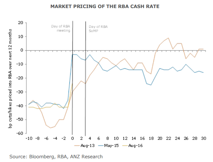 Official figures last week showed core annual inflation hit 1.5 percent in Q2, well below the RBA’s 2-3 percent target band. Australia created roughly 7,000 jobs a month on average this year, compared with more than 30,000 a month in the second half of 2015. Australia's June economic data was also particularly poor. The trade deficit widened to A$3.195 bln from a revised A$2.418 bln in May (from A$2.218 bln initially). Separately, building approvals unexpectedly fell 2.9 percent in June after a revised 5.4 percent drop in May (initially -5.2%). The median forecast was for an increase of nearly 1 percent.