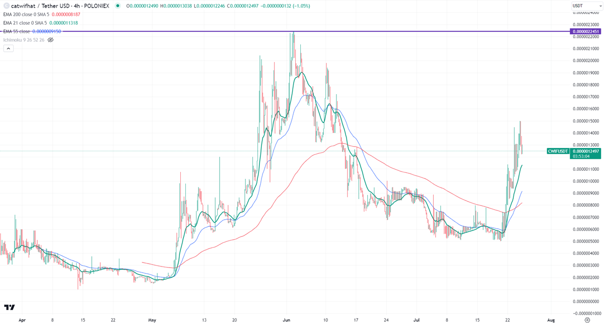 CWIFUSD gained more than 150% in the past five days. The pair holds well above the short-term (21 and 55 EMA) and long-term moving average. It hit a high of $0.0000014955 and is currently trading around $0.0000012490.