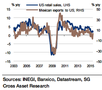 "In general, stronger manufacturing export growth in H2 2015 and 2016 should help keep the current account balance unchanged, although lower oil prices could also keep it from improving. Falling oil prices have hit both the external account and Mexico's public finances", says Societe Generale.
